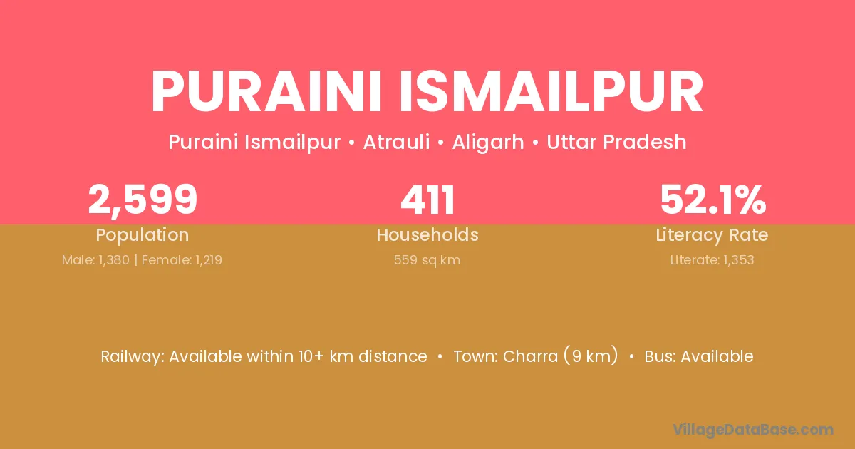 Puraini Ismailpur village has a total population of 2,599 people, of which 1,380 are males and 1,219 are females.