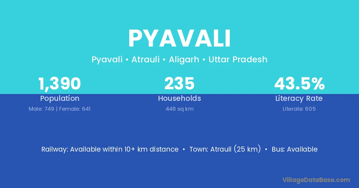 Atrauli (25 km) is the nearest town to Pyavali village for major economic activities and is located approximately 25 km away.