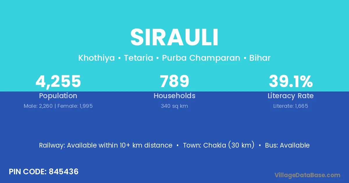 Charra (8 km) is the nearest town to Sirauli village for major economic activities and is located approximately 8 km away.