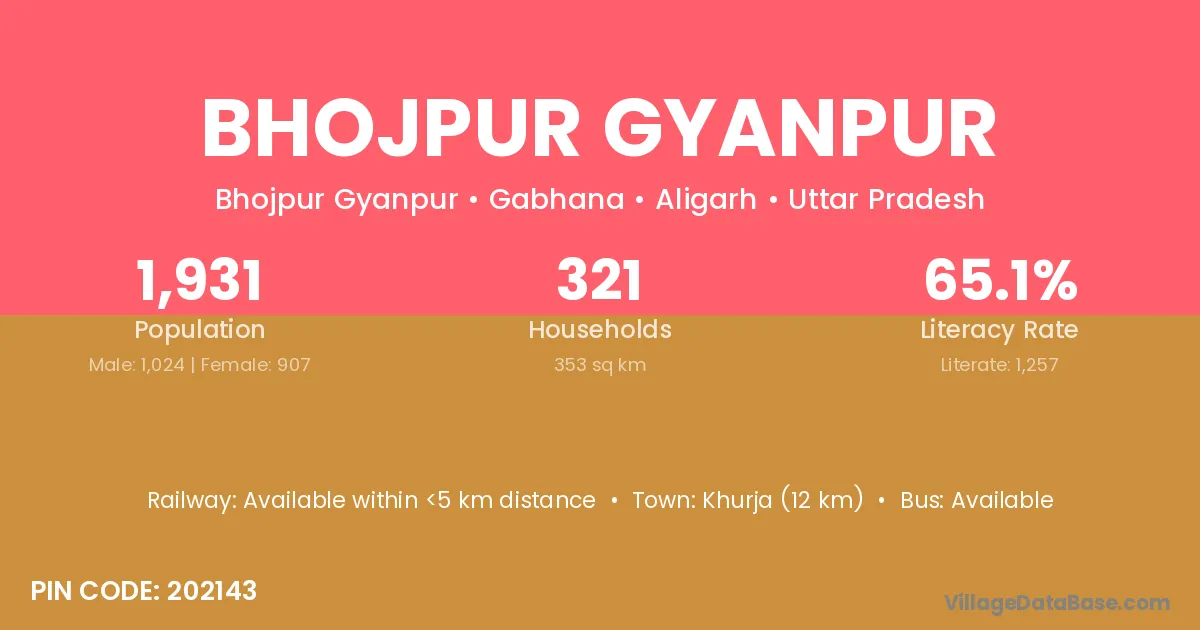 Khurja (12 km) is the nearest town to Bhojpur Gyanpur village for major economic activities and is located approximately 12 km away.