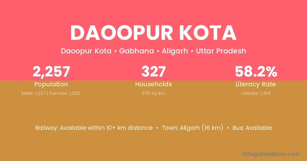 Aligarh (16 km) is the nearest town to Daoopur Kota village for major economic activities and is located approximately 16 km away.