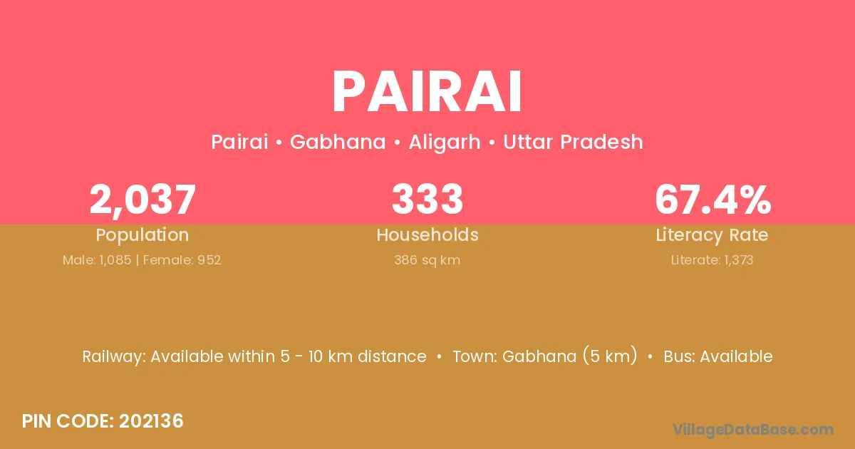 Pairai village has a total population of 2,037 people, of which 1,085 are males and 952 are females.