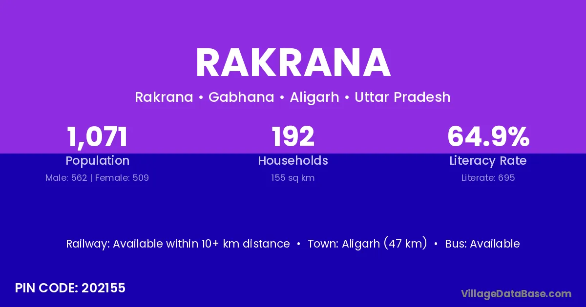 Aligarh (47 km) is the nearest town to Rakrana village for major economic activities and is located approximately 47 km away.
