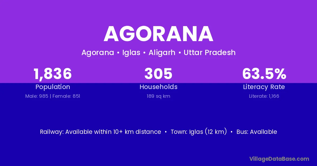 Iglas (12 km) is the nearest town to Agorana village for major economic activities and is located approximately 12 km away.