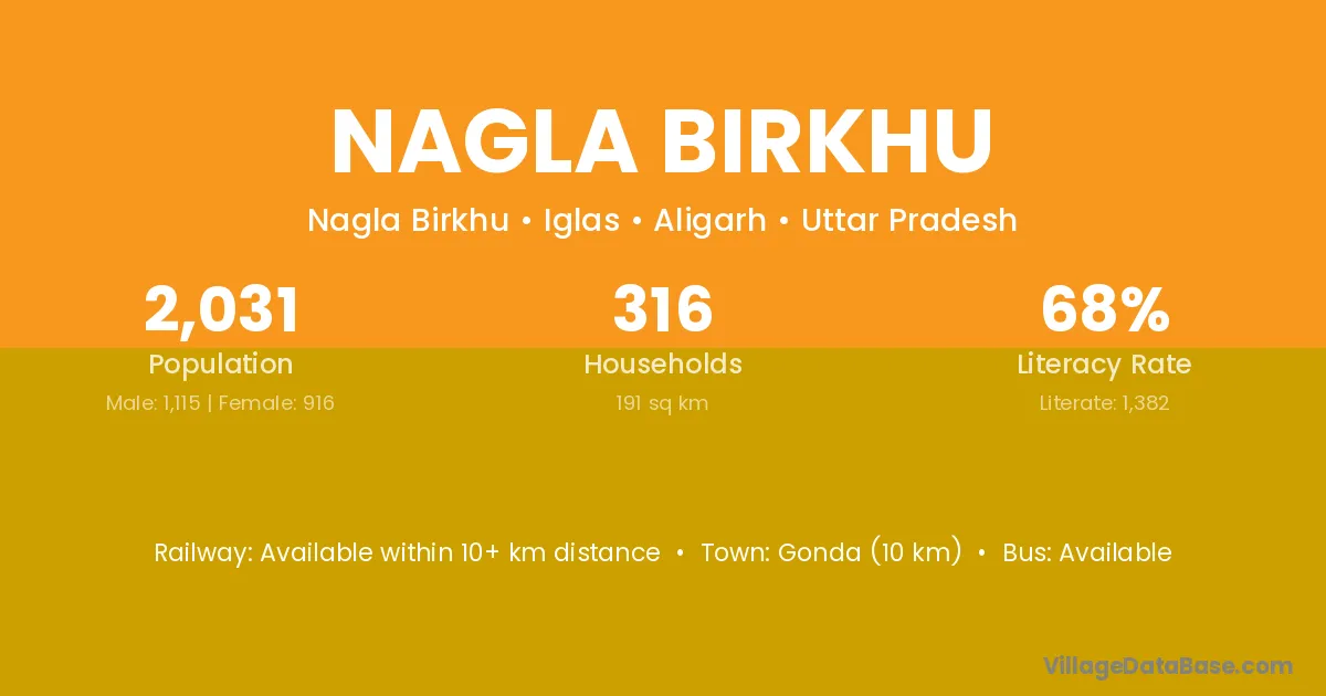 Gonda (10 km) is the nearest town to Nagla Birkhu village for major economic activities and is located approximately 10 km away.