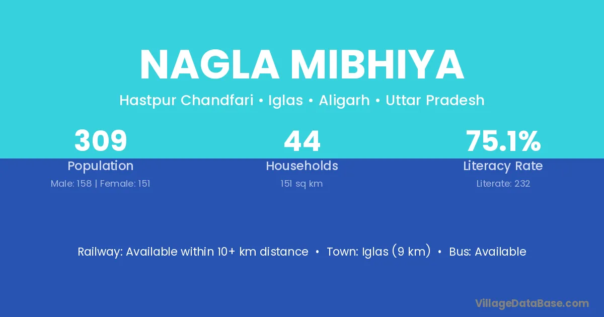 Nagla Mibhiya village has a total population of 309 people, of which 158 are males and 151 are females.