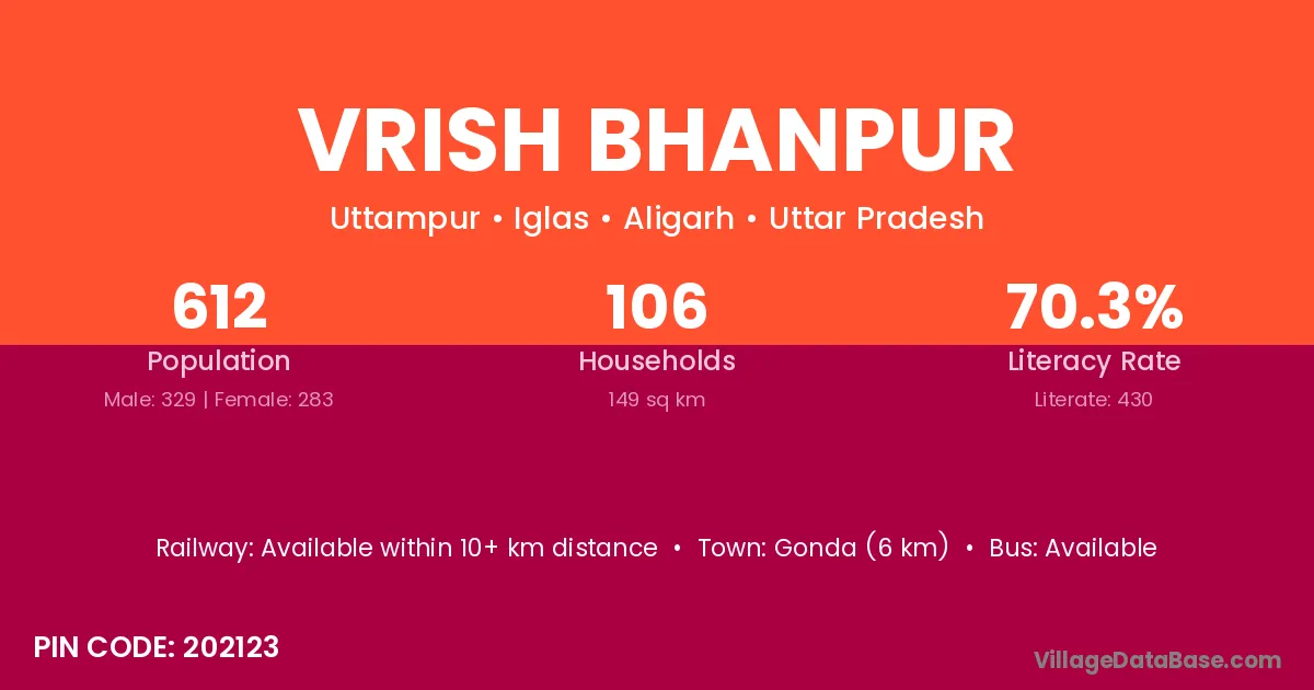 Vrish Bhanpur village has a total population of 612 people, of which 329 are males and 283 are females.