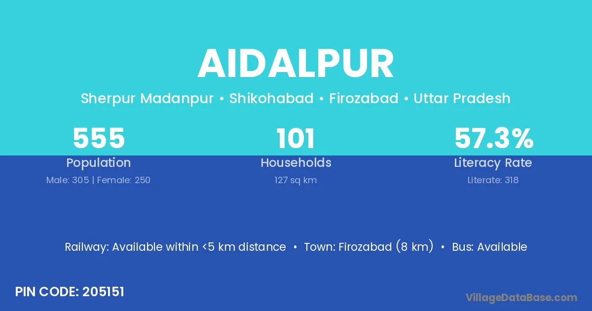 Khair (10 km) is the nearest town to Aidalpur village for major economic activities and is located approximately 10 km away.