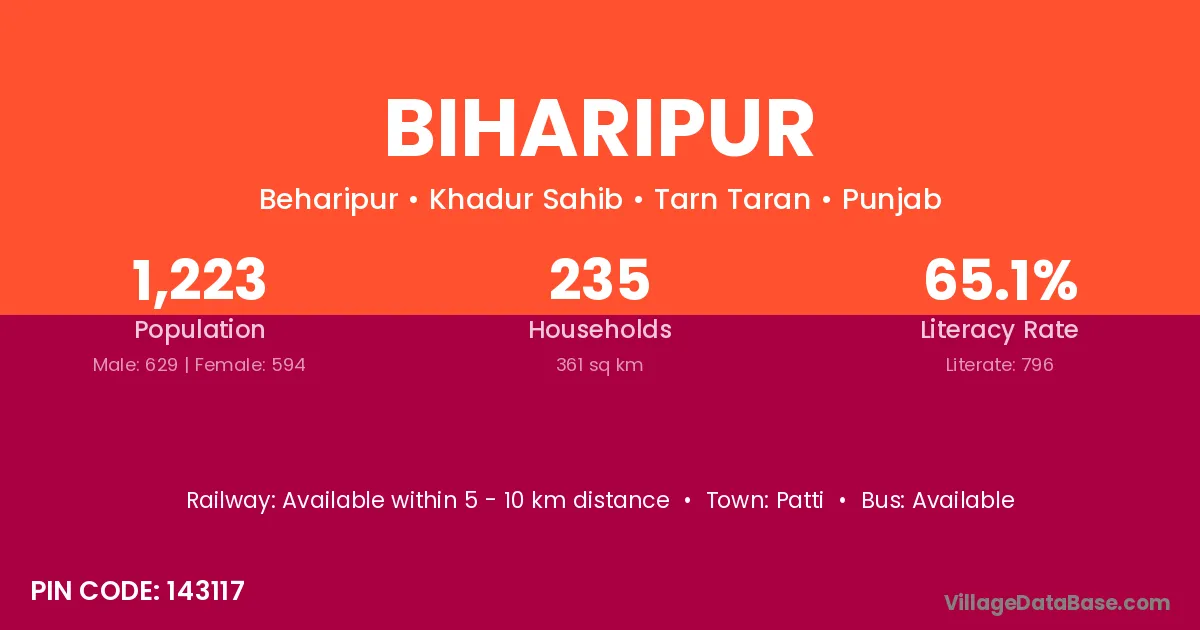 The literacy rate of Biharipur village is 67.24%. Male literacy stands at 79.29% and female literacy at 54.43%.