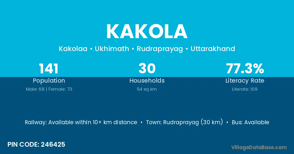 The literacy rate of Kakola village is 58.24%. Male literacy stands at 68.20% and female literacy at 46.77%.