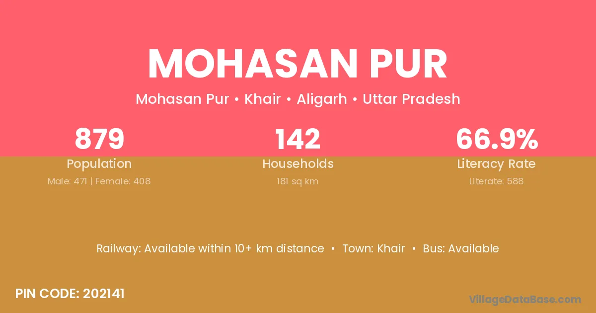 Mohasan Pur village has a total population of 879 people, of which 471 are males and 408 are females.