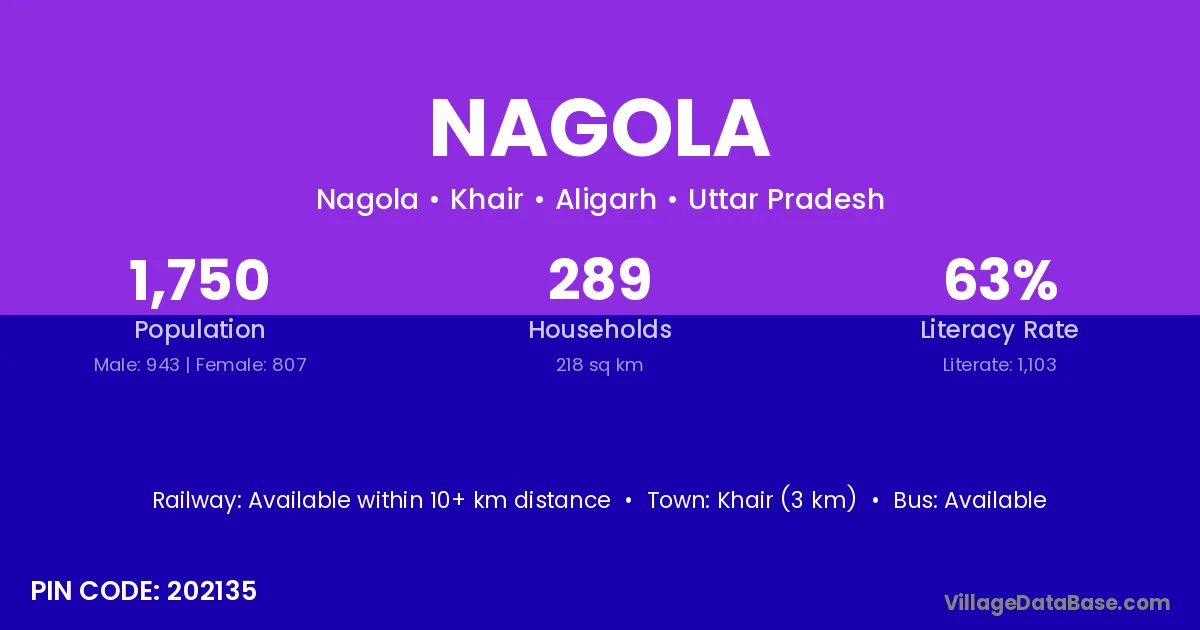 Khair (3 km) is the nearest town to Nagola village for major economic activities and is located approximately 3 km away.