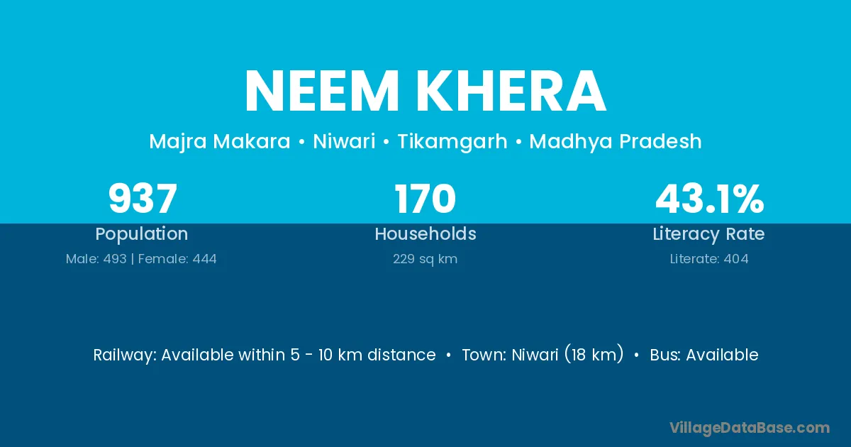 The literacy rate of Neem Khera village is 60.50%. Male literacy stands at 71.91% and female literacy at 46.87%.