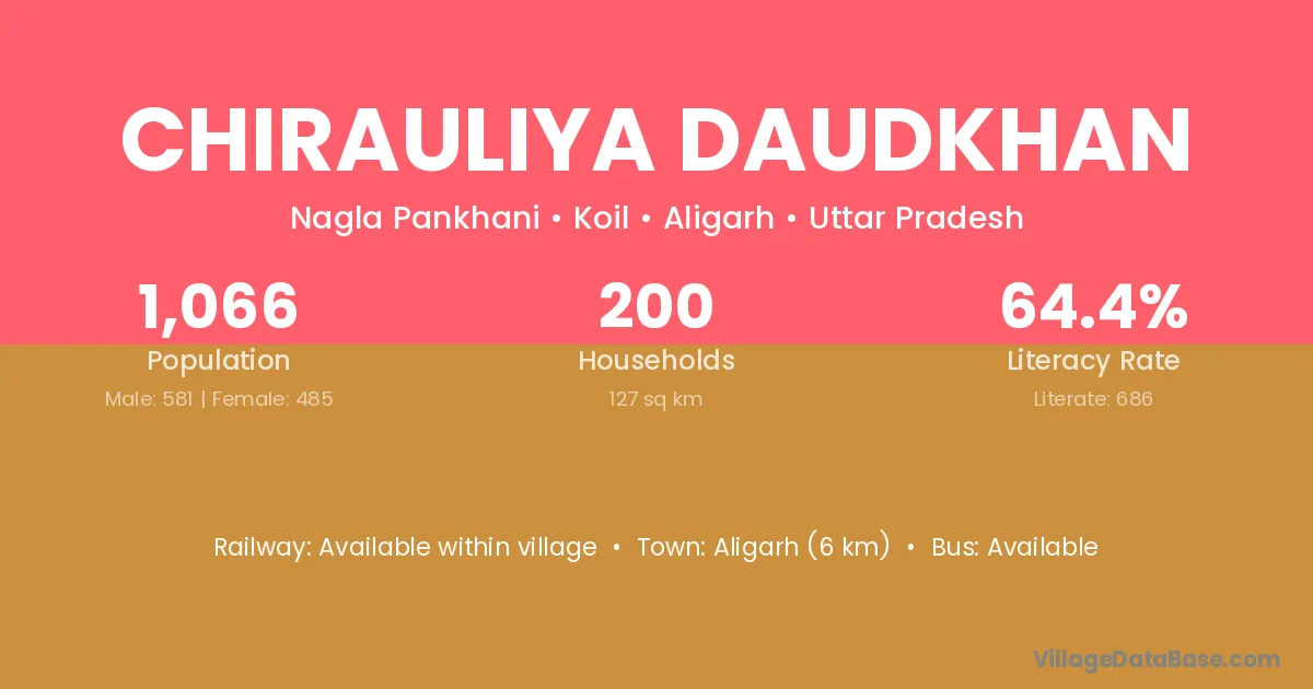 Aligarh (6 km) is the nearest town to Chirauliya Daudkhan village for major economic activities and is located approximately 6 km away.