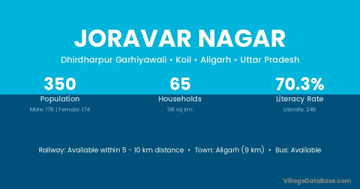 Aligarh (9 km) is the nearest town to Joravar Nagar village for major economic activities and is located approximately 9 km away.