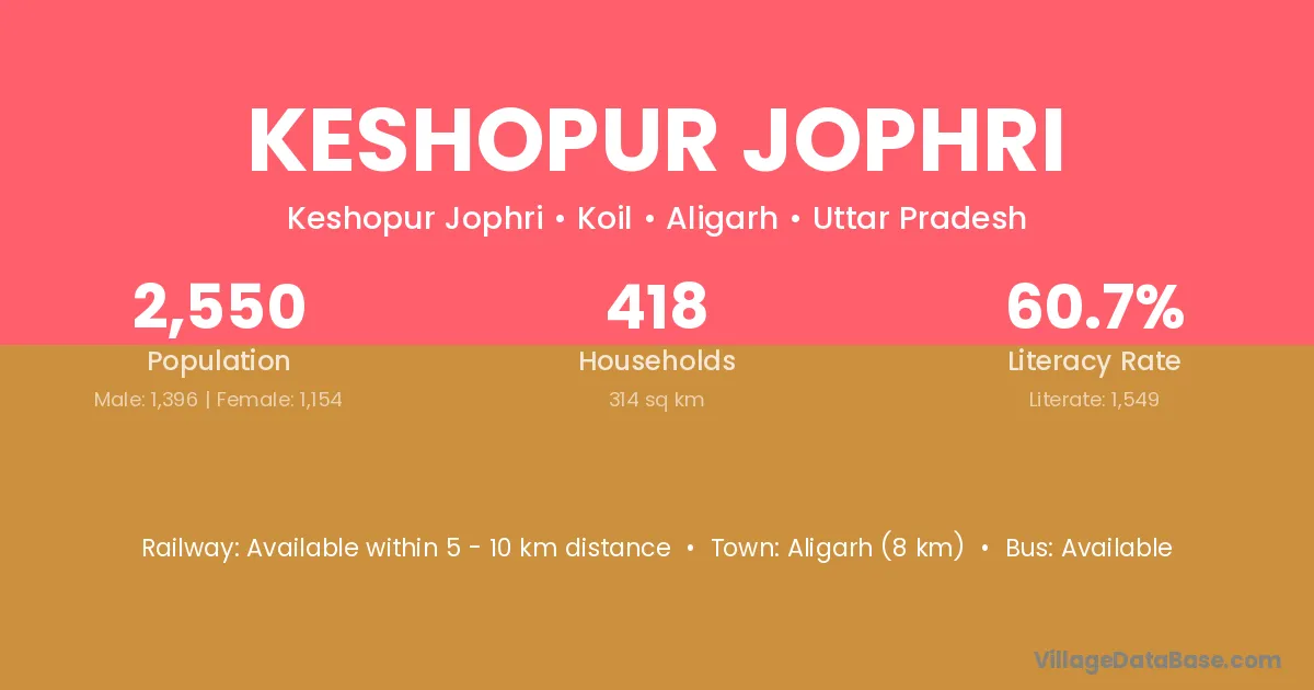 Aligarh (8 km) is the nearest town to Keshopur Jophri village for major economic activities and is located approximately 8 km away.