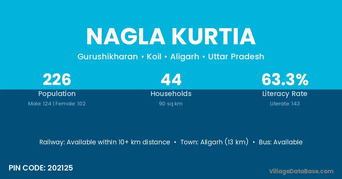Aligarh (13 km) is the nearest town to Nagla Kurtia village for major economic activities and is located approximately 13 km away.