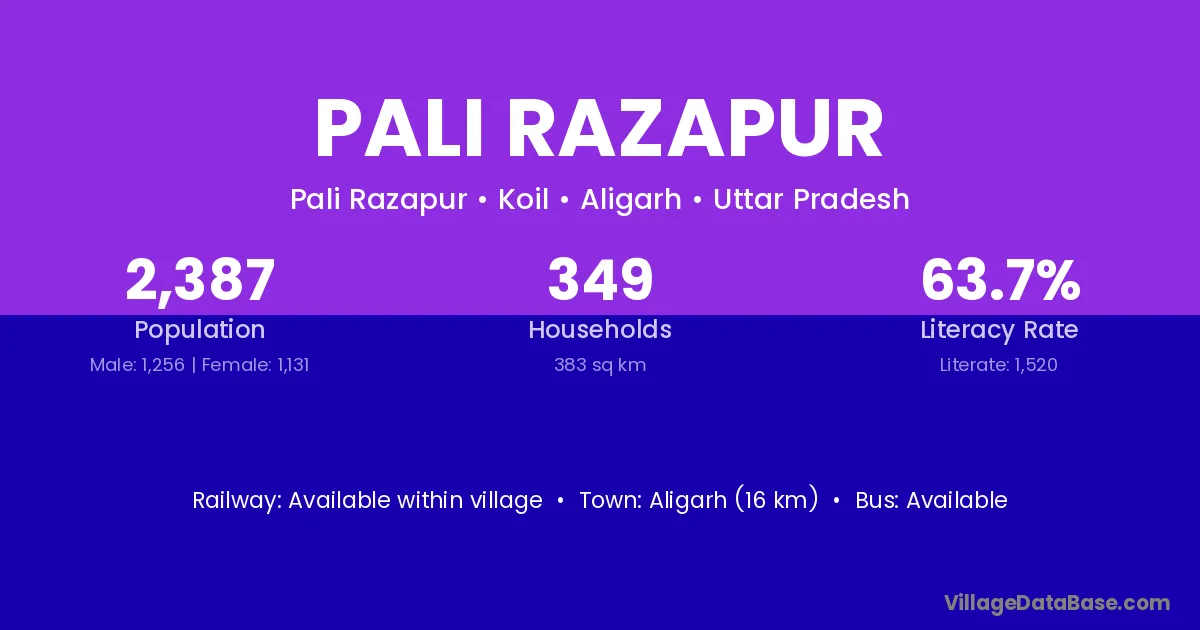 Aligarh (16 km) is the nearest town to Pali Razapur village for major economic activities and is located approximately 16 km away.