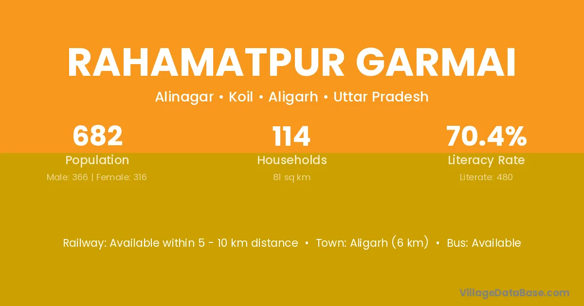 Aligarh (6 km) is the nearest town to Rahamatpur Garmai village for major economic activities and is located approximately 6 km away.