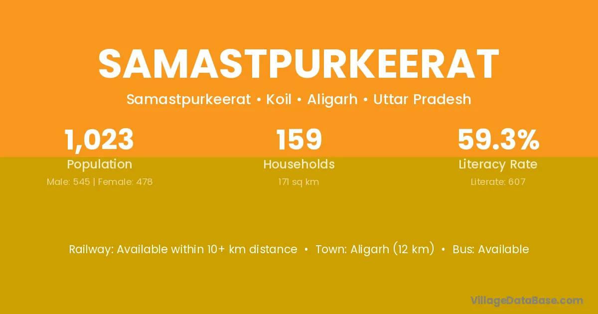 Aligarh (12 km) is the nearest town to Samastpurkeerat village for major economic activities and is located approximately 12 km away.