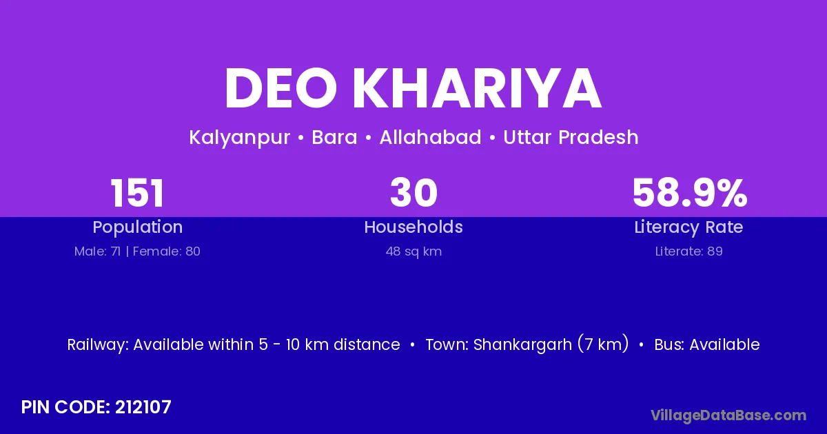 Shankargarh (7 km) is the nearest town to Deo Khariya village for major economic activities and is located approximately 7 km away.
