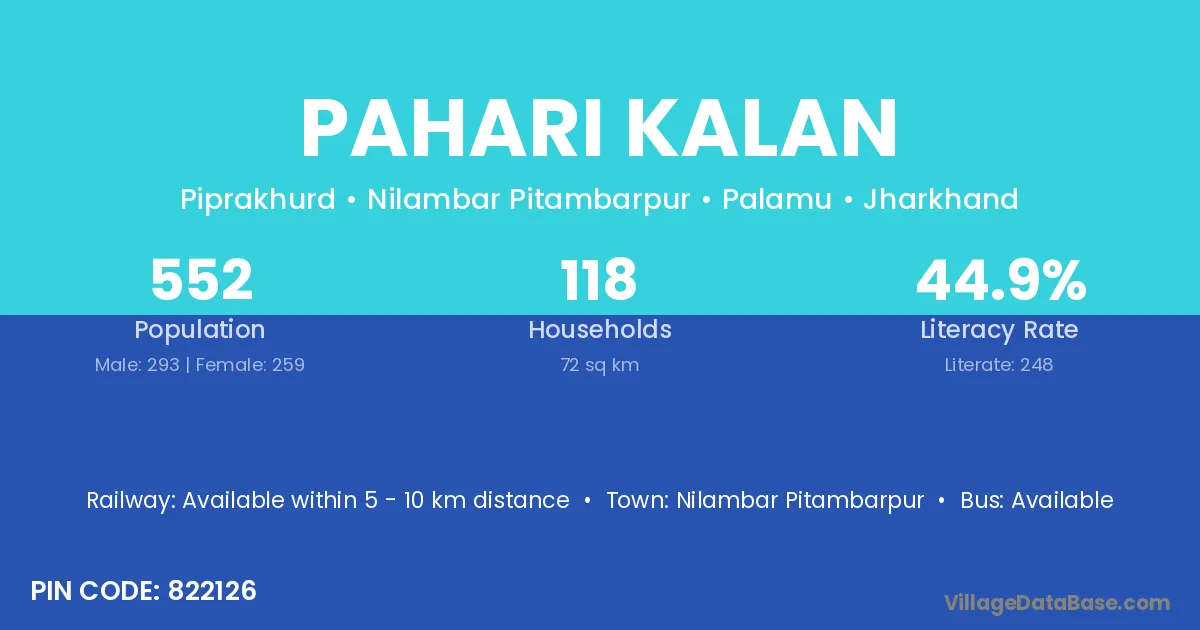Alld (62 km) is the nearest town to Pahari Kalan village for major economic activities and is located approximately 62 km away.