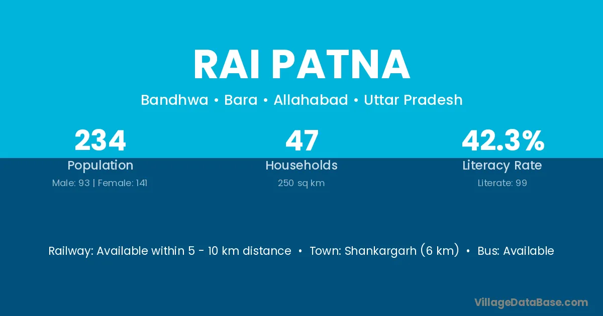 Shankargarh (6 km) is the nearest town to Rai Patna village for major economic activities and is located approximately 6 km away.