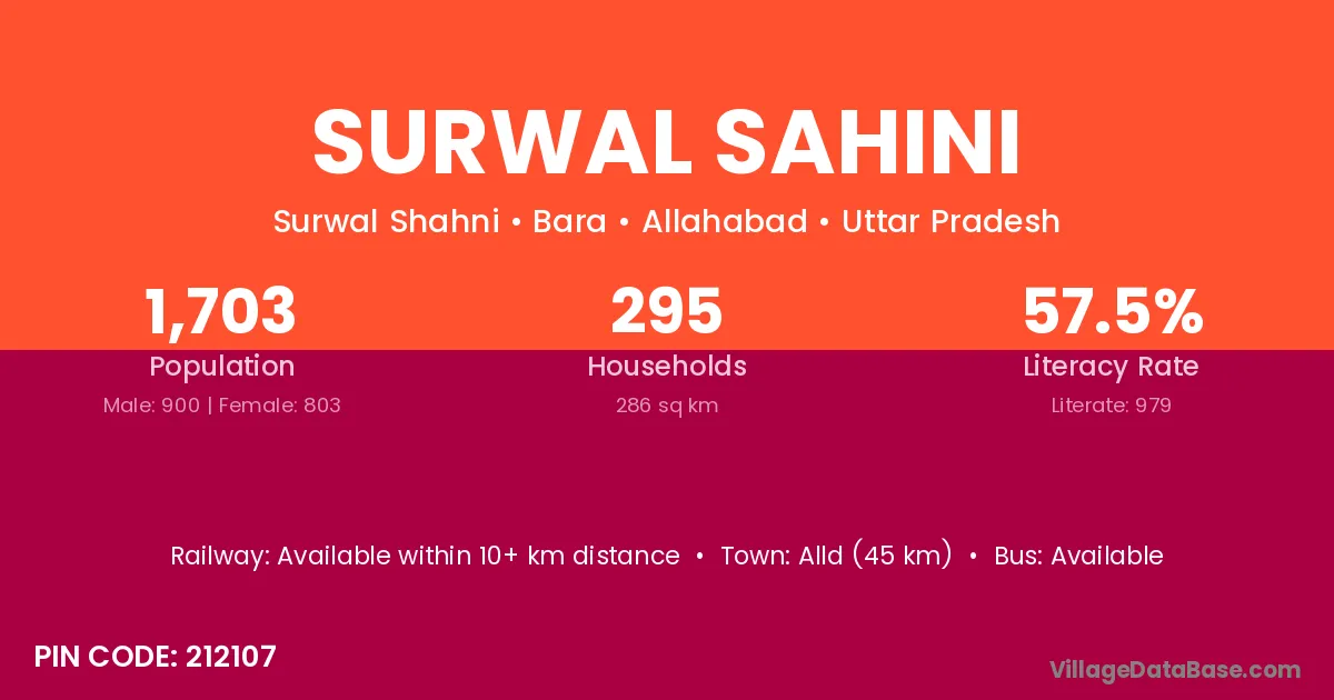 Alld (45 km) is the nearest town to Surwal Sahini village for major economic activities and is located approximately 45 km away.