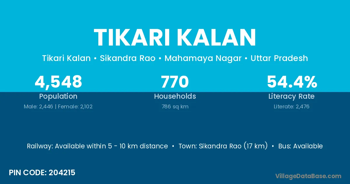 Alld (33 km) is the nearest town to Tikari Kalan village for major economic activities and is located approximately 33 km away.