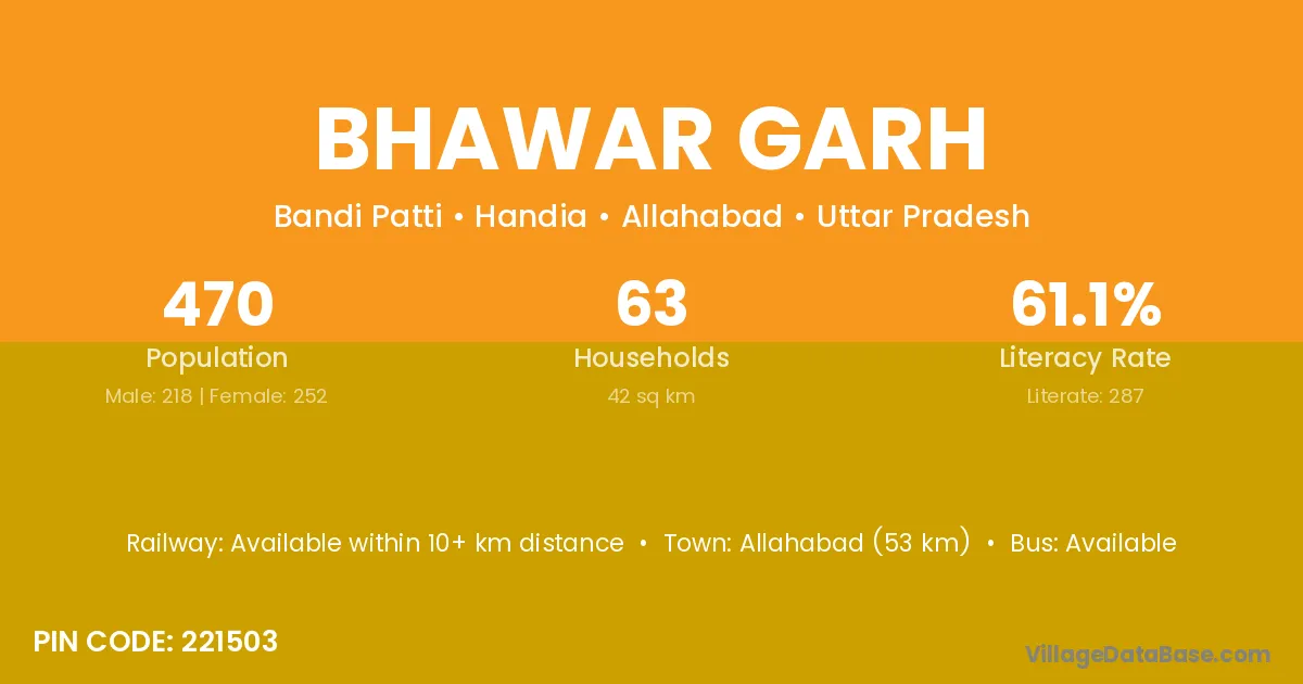 Allahabad (53 km) is the nearest town to Bhawar Garh village for major economic activities and is located approximately 53 km away.