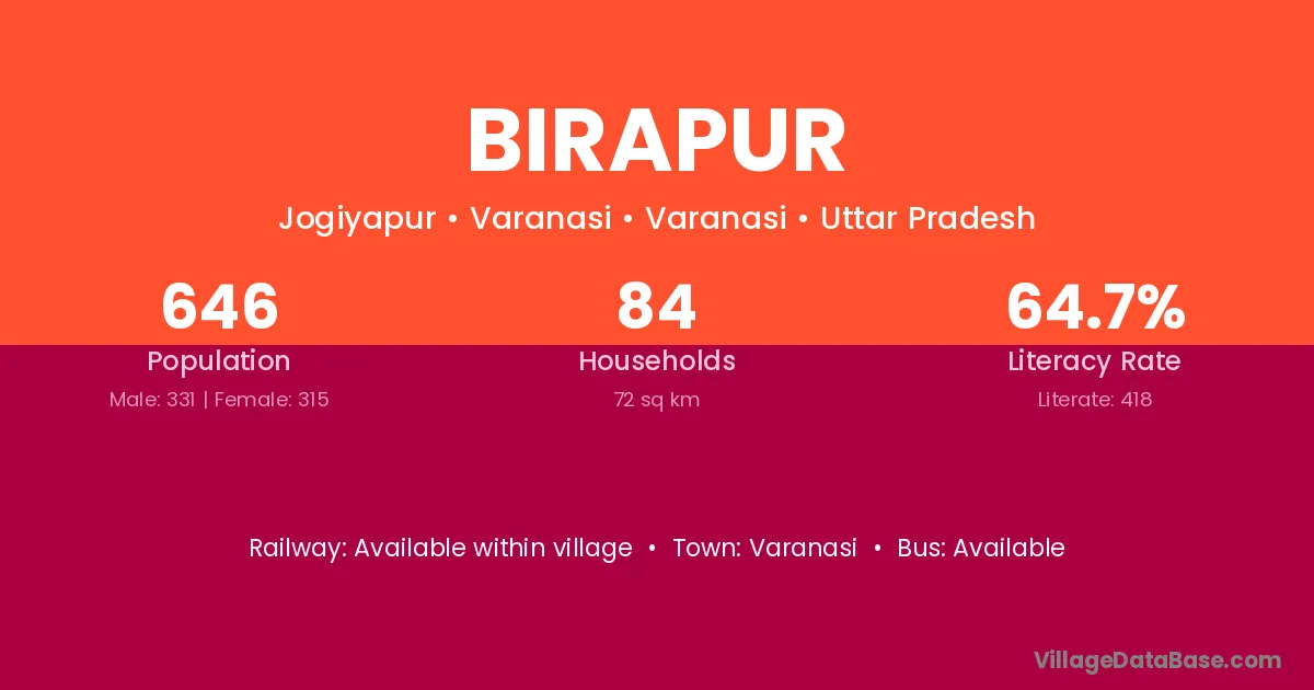 Handia (36 km) is the nearest town to Birapur village for major economic activities and is located approximately 36 km away.