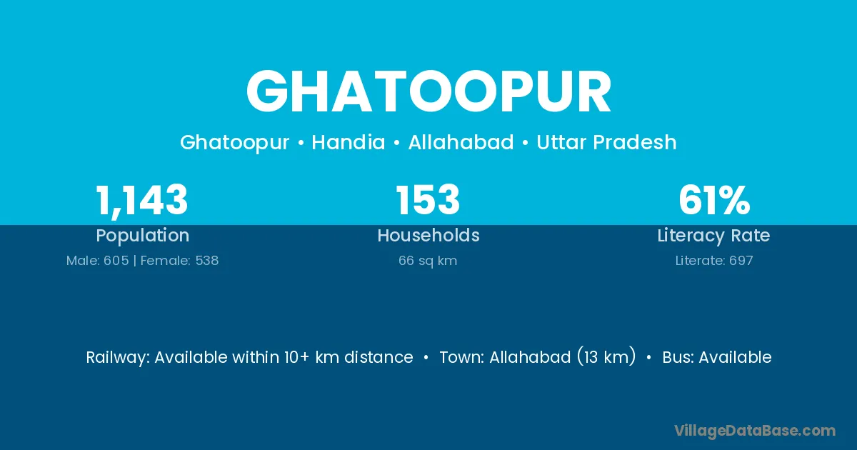 Allahabad (13 km) is the nearest town to Ghatoopur village for major economic activities and is located approximately 13 km away.