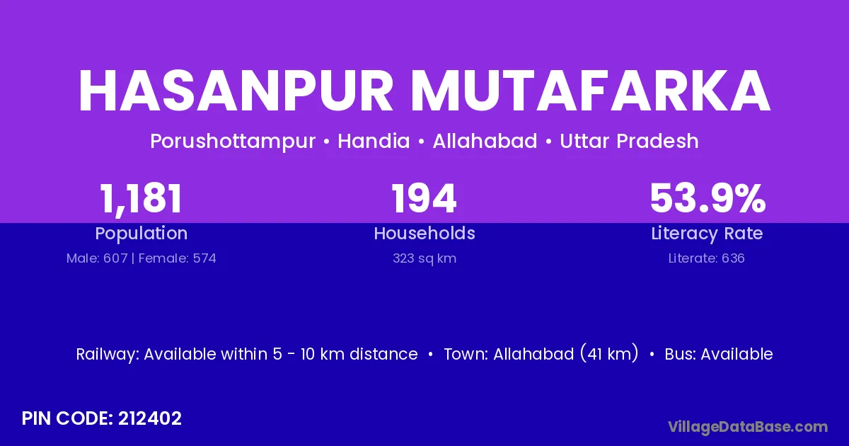 Allahabad (41 km) is the nearest town to Hasanpur Mutafarka village for major economic activities and is located approximately 41 km away.