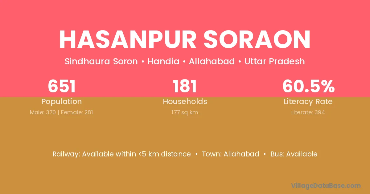 Hasanpur Soraon village has a total population of 651 people, of which 370 are males and 281 are females.