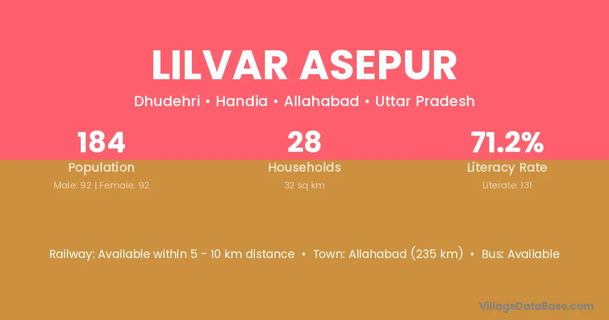 Allahabad (235 km) is the nearest town to Lilvar Asepur village for major economic activities and is located approximately 235 km away.