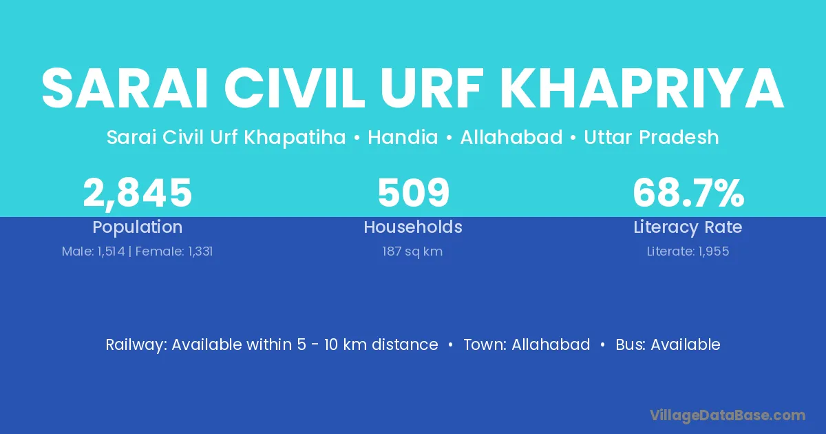Sarai Civil Urf Khapriya village has a total population of 2,845 people, of which 1,514 are males and 1,331 are females.