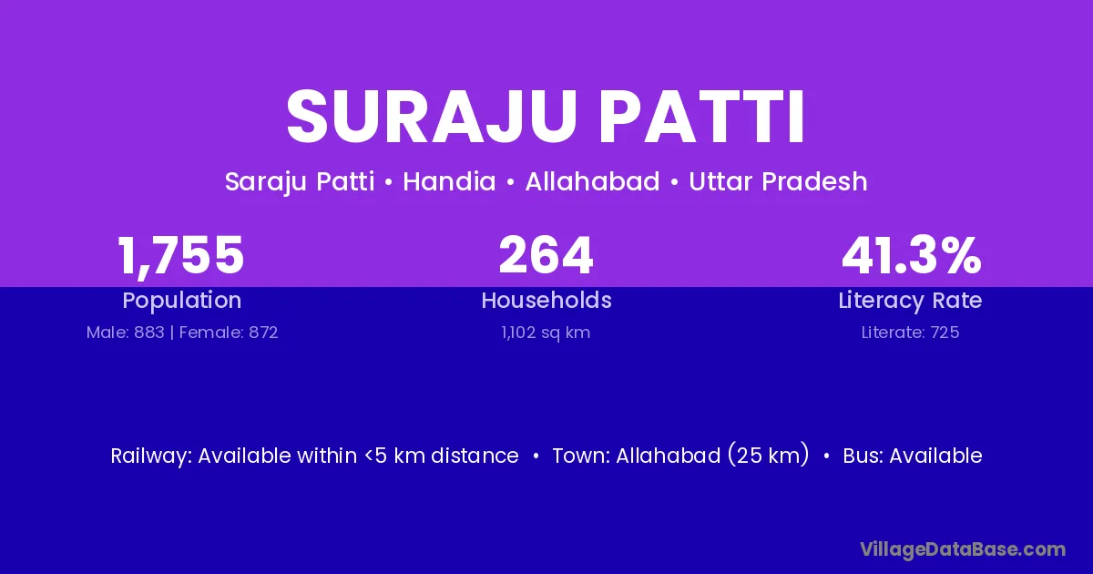 Allahabad (25 km) is the nearest town to Suraju Patti village for major economic activities and is located approximately 25 km away.