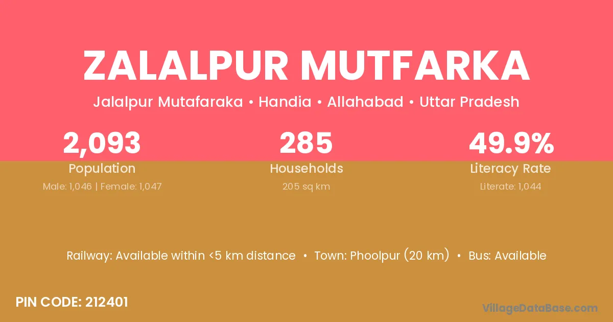 Phoolpur (20 km) is the nearest town to Zalalpur Mutfarka village for major economic activities and is located approximately 20 km away.