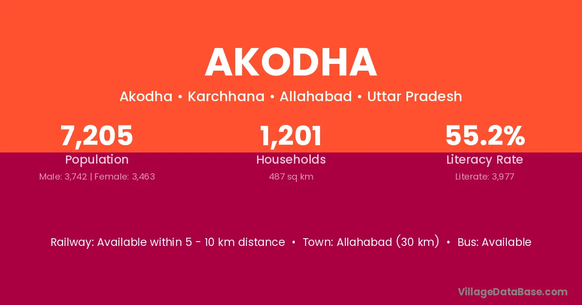 Allahabad (30 km) is the nearest town to Akodha village for major economic activities and is located approximately 30 km away.