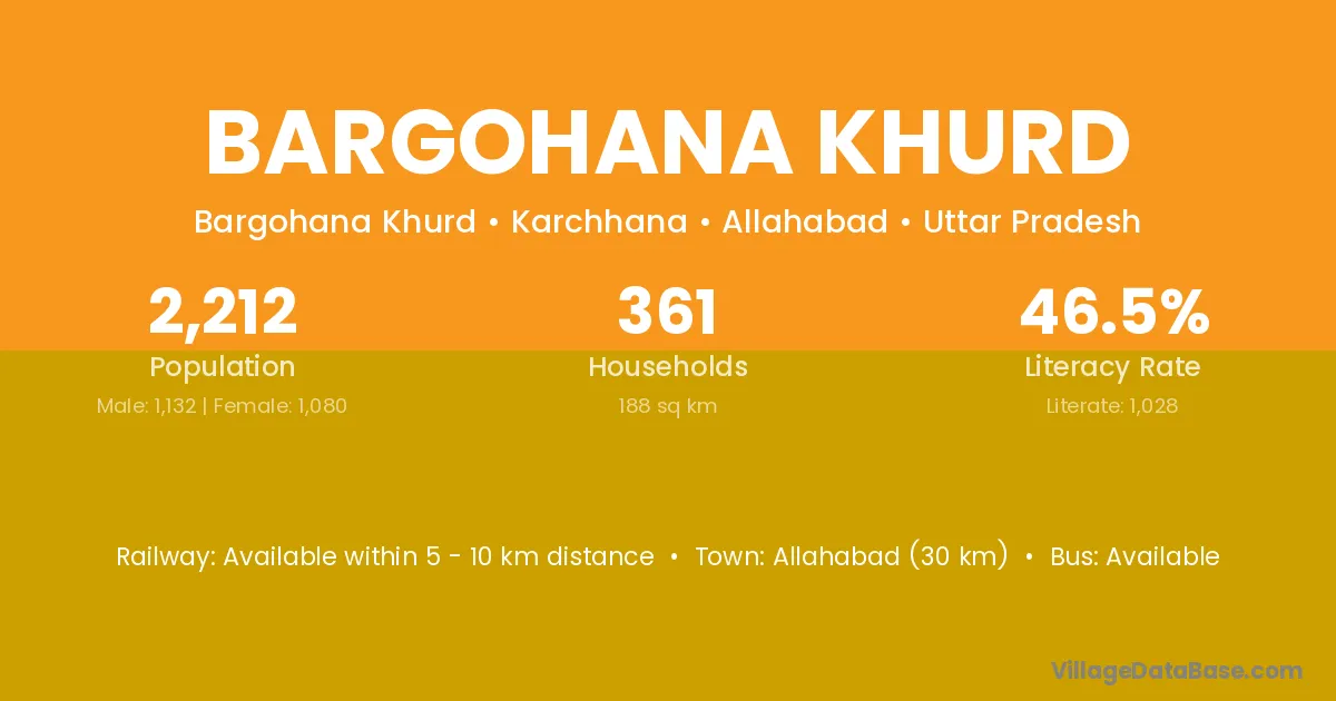 Allahabad (30 km) is the nearest town to Bargohana Khurd village for major economic activities and is located approximately 30 km away.