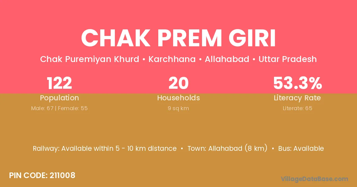 Allahabad (8 km) is the nearest town to Chak Prem Giri village for major economic activities and is located approximately 8 km away.