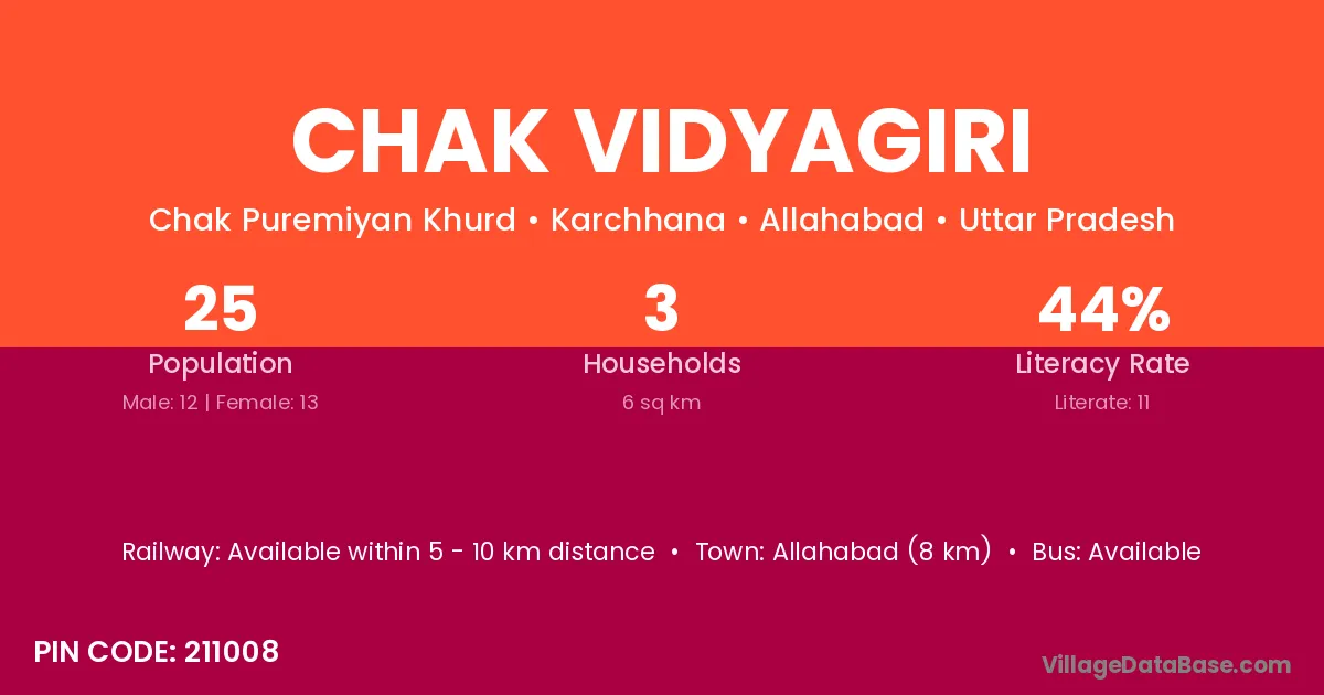 Allahabad (8 km) is the nearest town to Chak Vidyagiri village for major economic activities and is located approximately 8 km away.