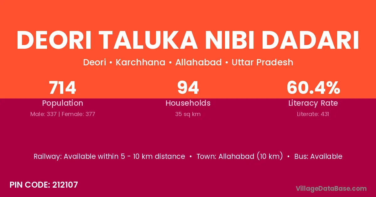 Allahabad (10 km) is the nearest town to Deori Taluka Nibi Dadari village for major economic activities and is located approximately 10 km away.