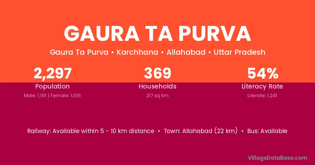 Allahabad (22 km) is the nearest town to Gaura Ta Purva village for major economic activities and is located approximately 22 km away.