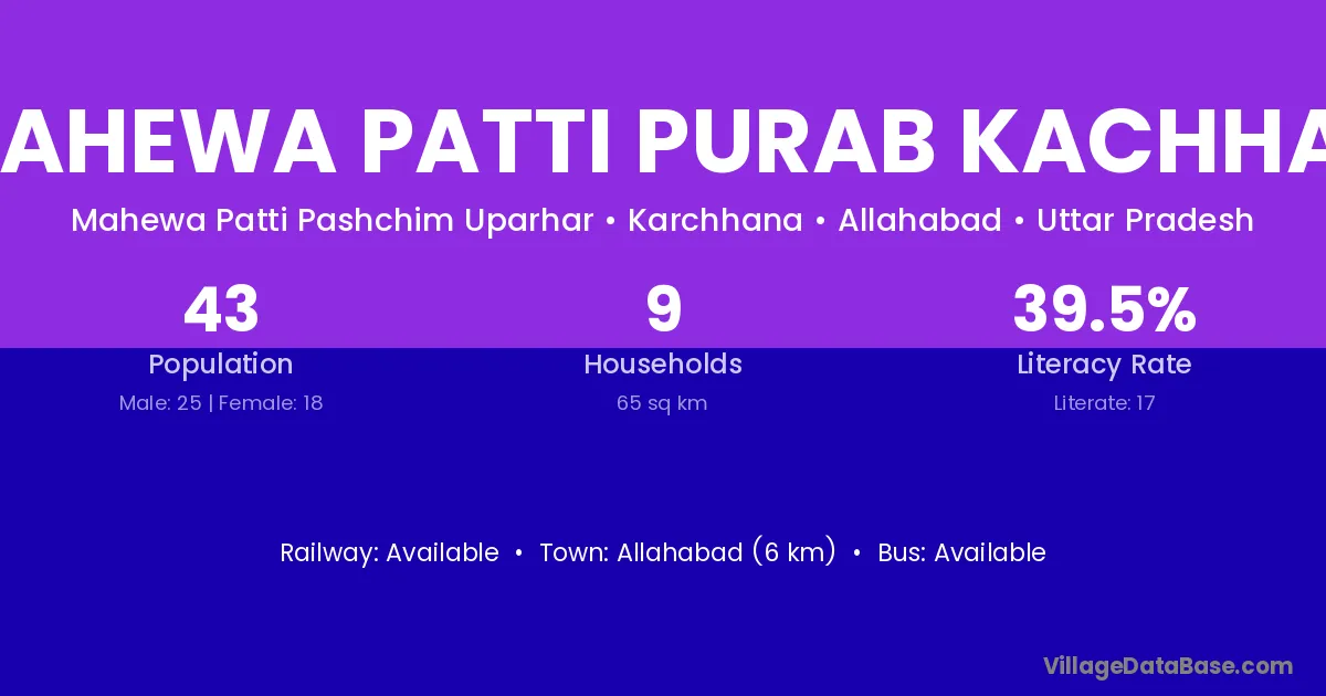 Mahewa Patti Purab Kachhar village has a total population of 43 people, of which 25 are males and 18 are females.