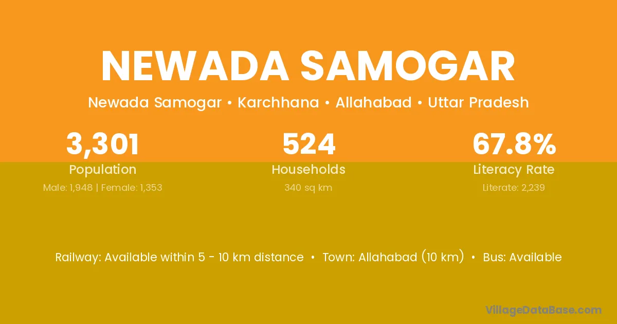 Allahabad (10 km) is the nearest town to Newada Samogar village for major economic activities and is located approximately 10 km away.