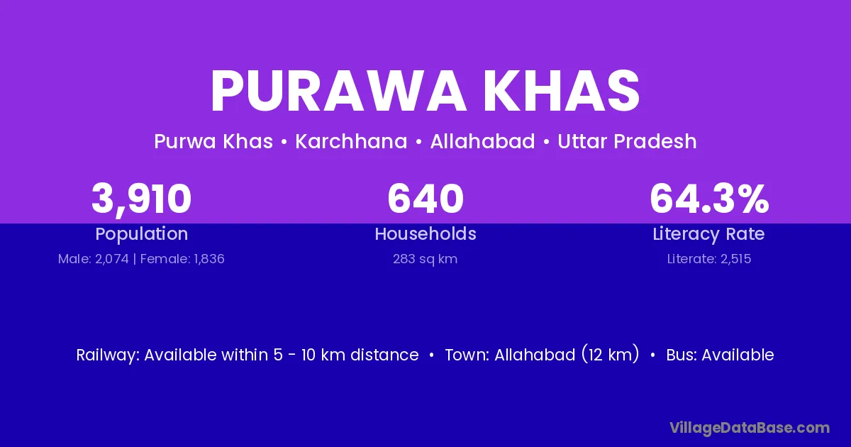 Allahabad (12 km) is the nearest town to Purawa Khas village for major economic activities and is located approximately 12 km away.