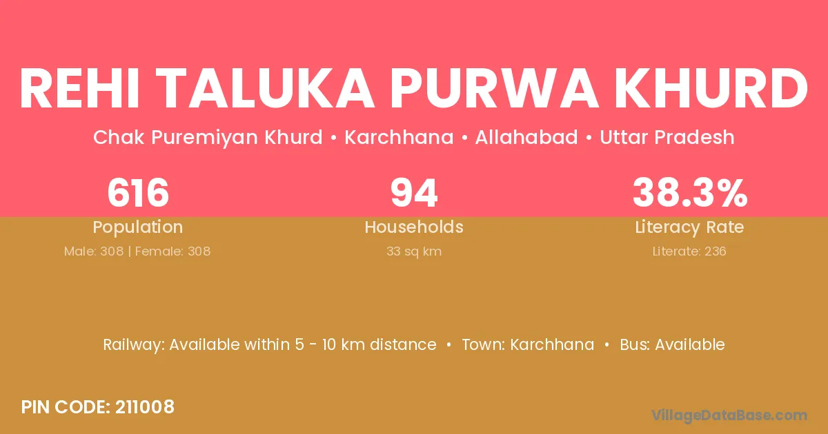 Rehi Taluka Purwa Khurd village has a total population of 616 people, of which 308 are males and 308 are females.