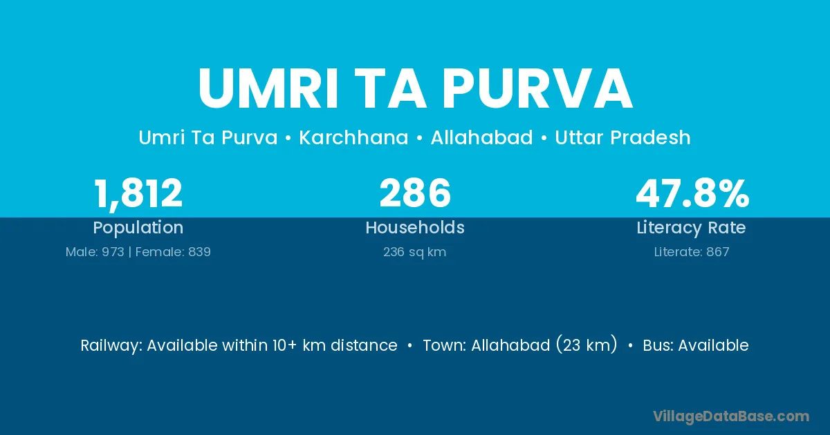 Allahabad (23 km) is the nearest town to Umri Ta Purva village for major economic activities and is located approximately 23 km away.