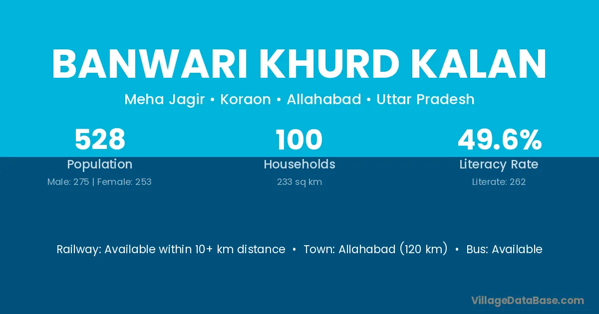 Allahabad (120 km) is the nearest town to Banwari Khurd Kalan village for major economic activities and is located approximately 120 km away.